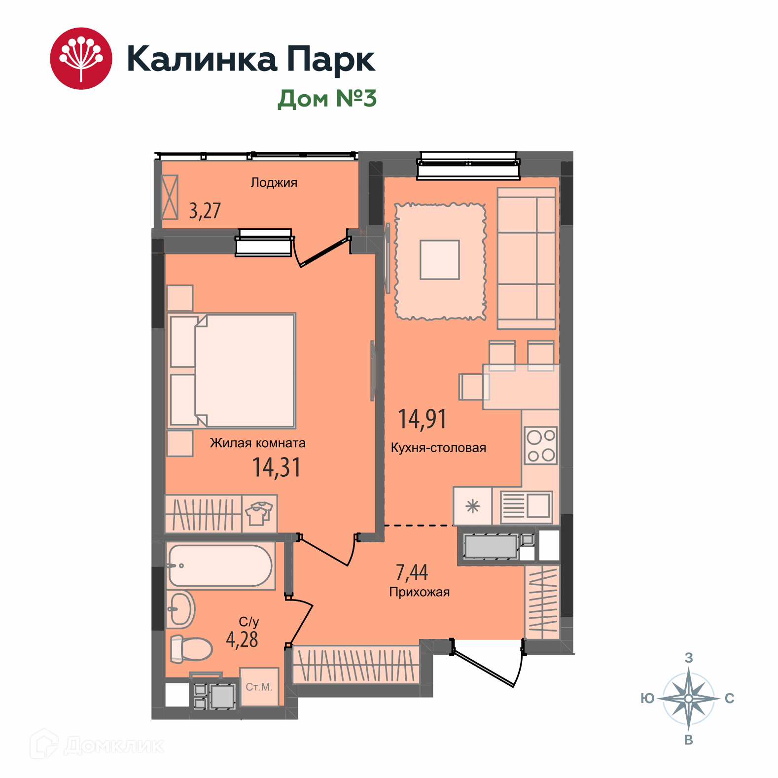 Планировка 1 комн. в ЖК "Калинка Парк"
