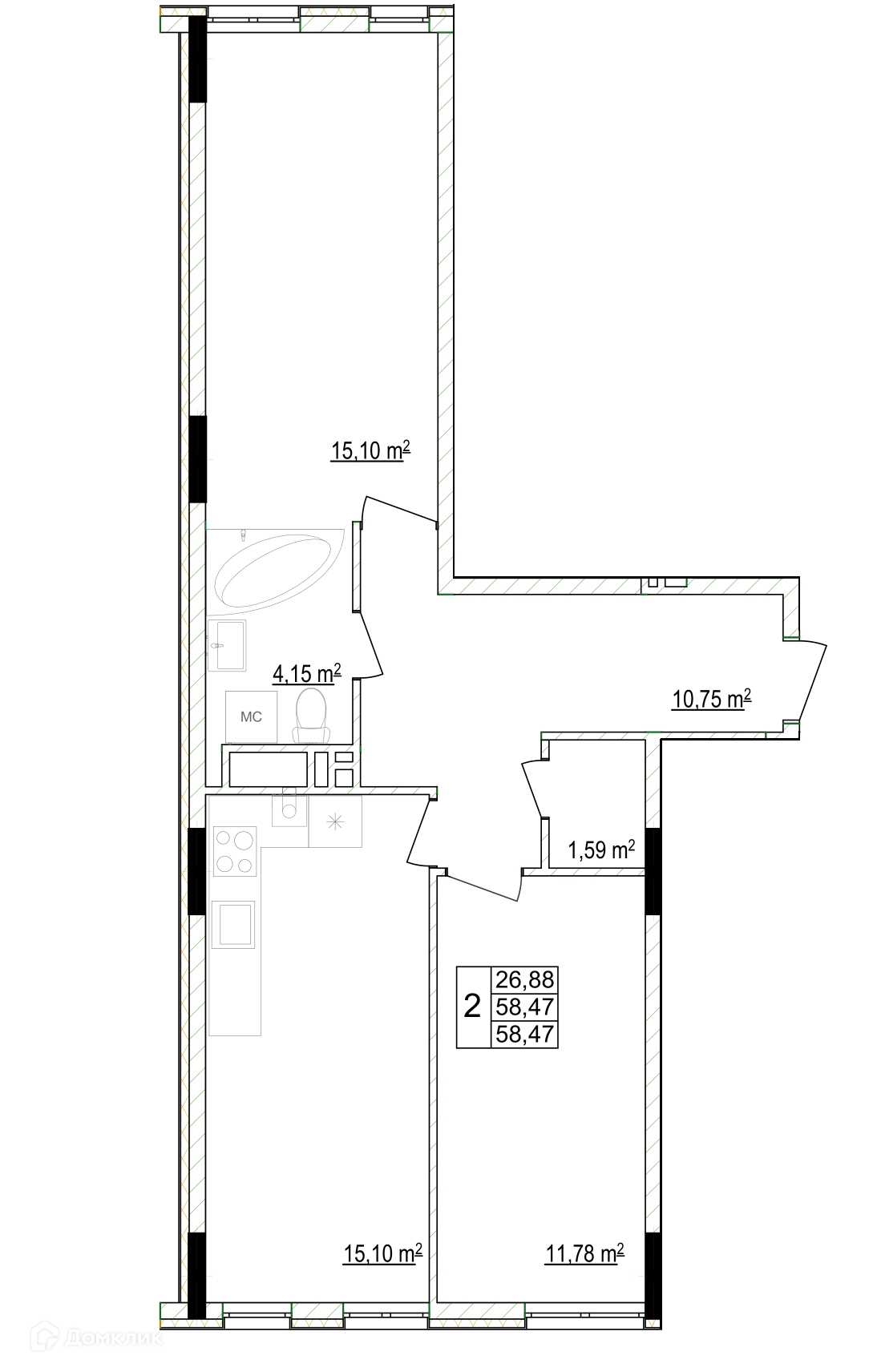 - Общая площадь: 58.47 м²